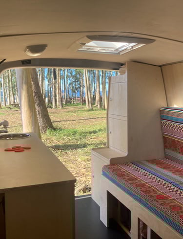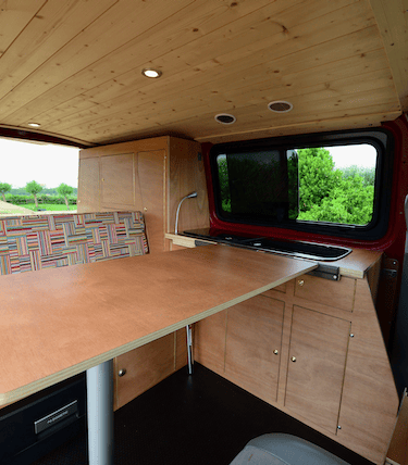 Ici, la banquette (convertible en lit) est latérale, une version permet de loger les objets longs (surfs, skis, etc)
